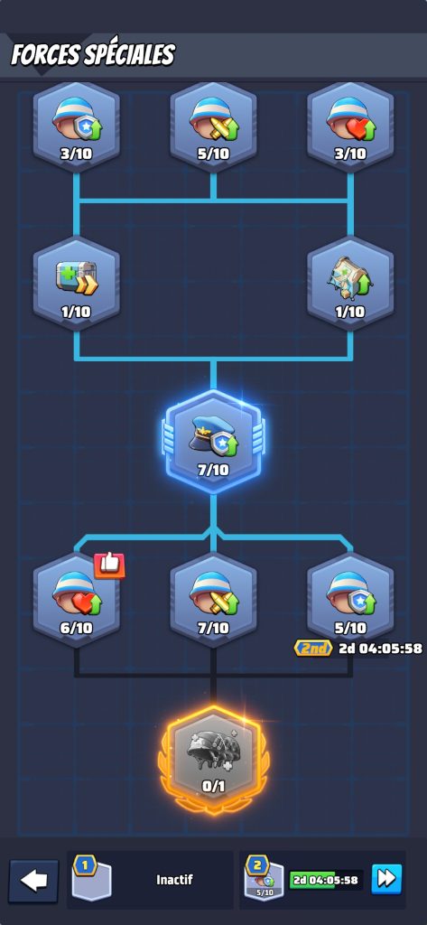 Le but, vous l’aurez compris, est d’activer le plus rapidement possible la possibilité d’obtenir les soldats T10. Il faut donc concentrer ses efforts là dessus mais ça vous coûtera extrêmement cher en or. Donc pensez à bien up vos mines avant.