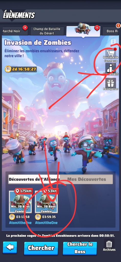 Prenez une ‘petite’ team et parcourez la map pour les attaquer, vous risquez rien. Au fur et à mesure vous allez ‘poper’ (faire apparaître) des boss zombies. Dès leur apparition, lancez un ralliement dessus et invitez les copains à rejoindre sur le chat alliance.