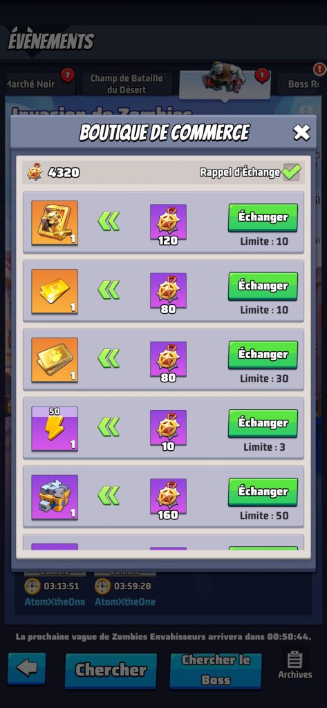 Aller ensuite régulièrement sur ‘Événements’–> ‘Invasion de zombies’ et allez échanger vos récompenses dans la boutique zombies.